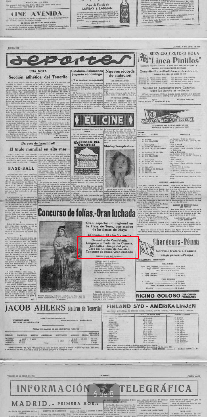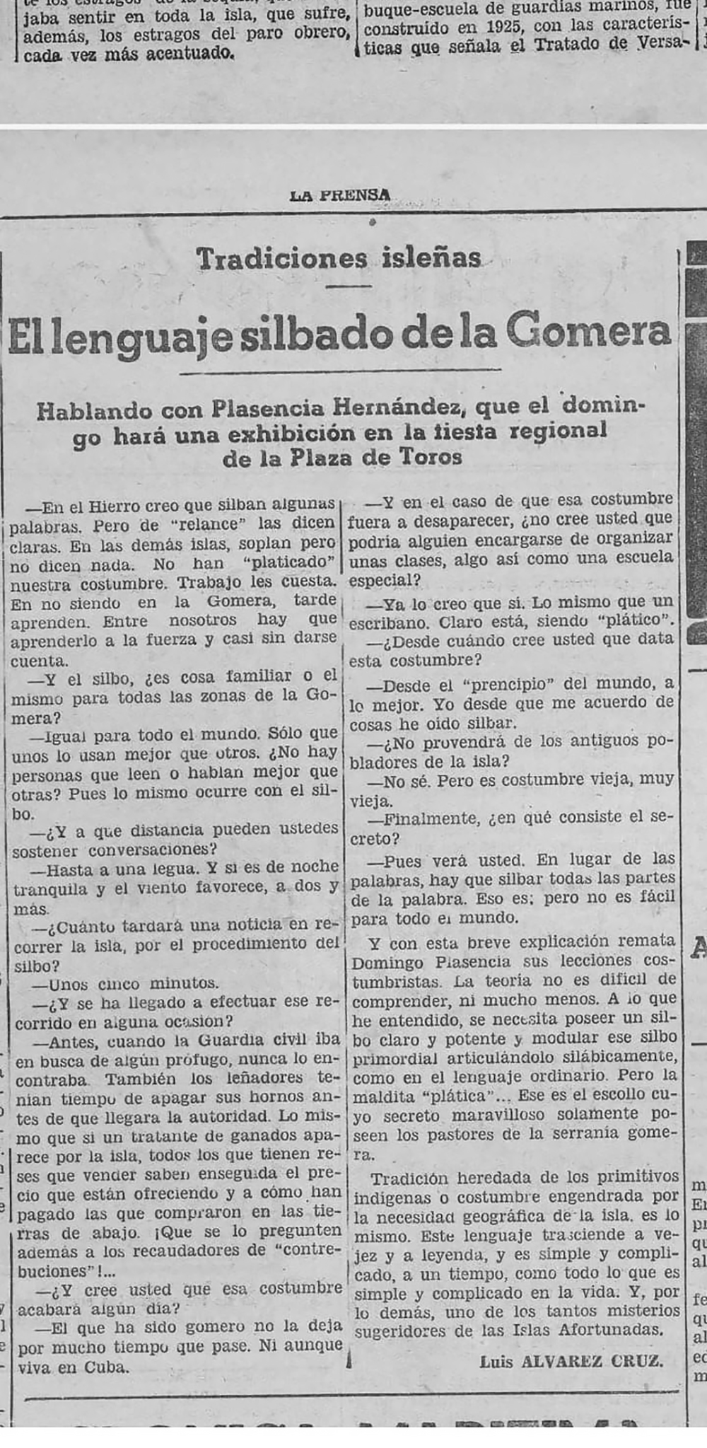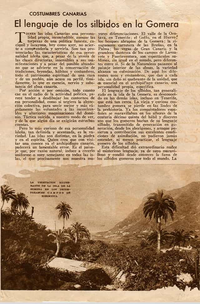 ‘Lenguaje silbado de La Gomera’. Tradiciones isleñas. 1935. La prensa.