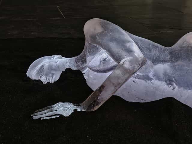 Sound installation with resin body and audio-reactive light on sand.
